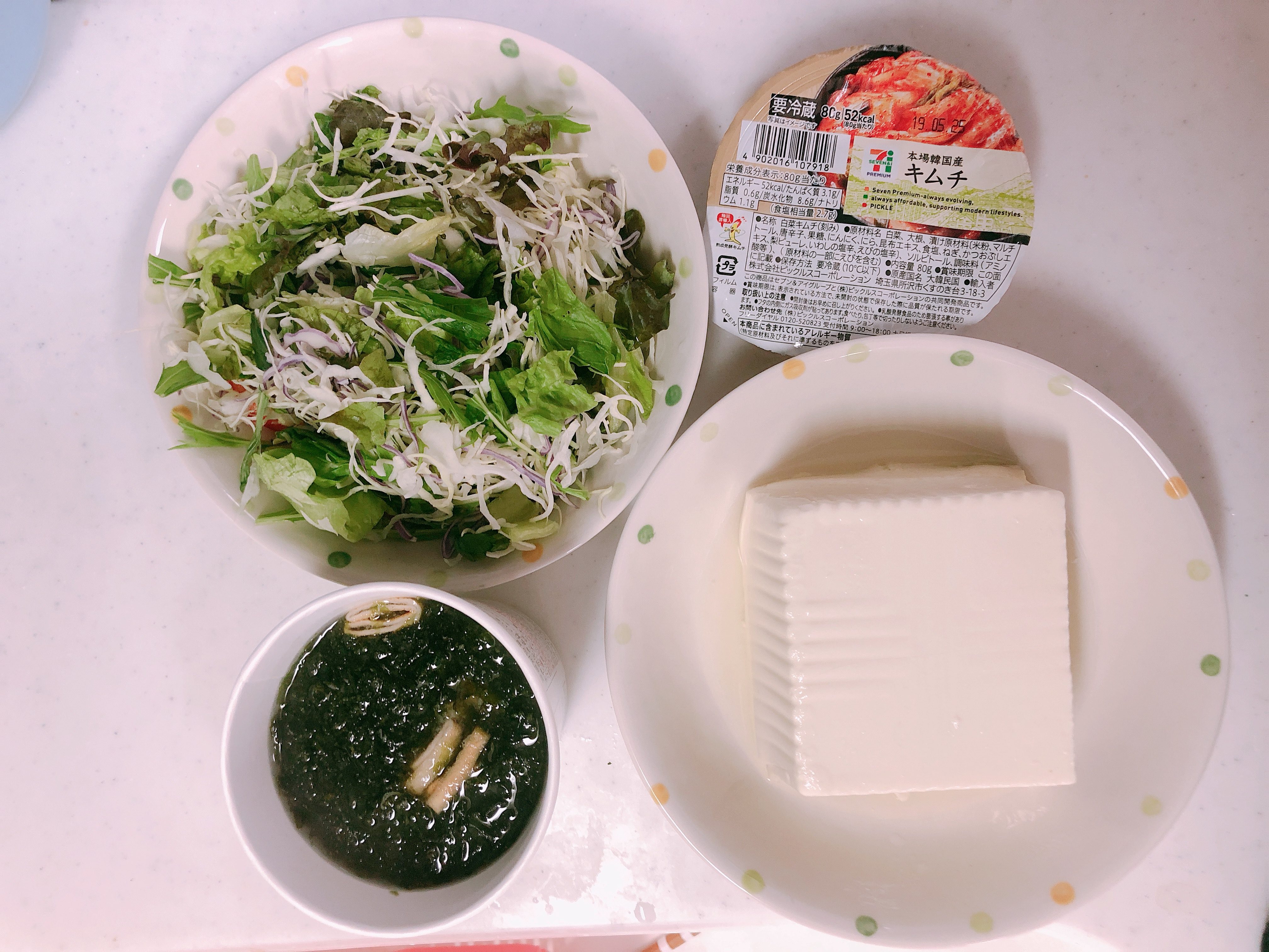 夜は動物性よりも植物性のタンパク質が良いので、豆腐をメインに食べました。また、カップの味噌汁には海苔も入っているので、海藻も摂れます。これまでトレーナーさんに習ったことをこの夕食に活かせたのではないかと思います。