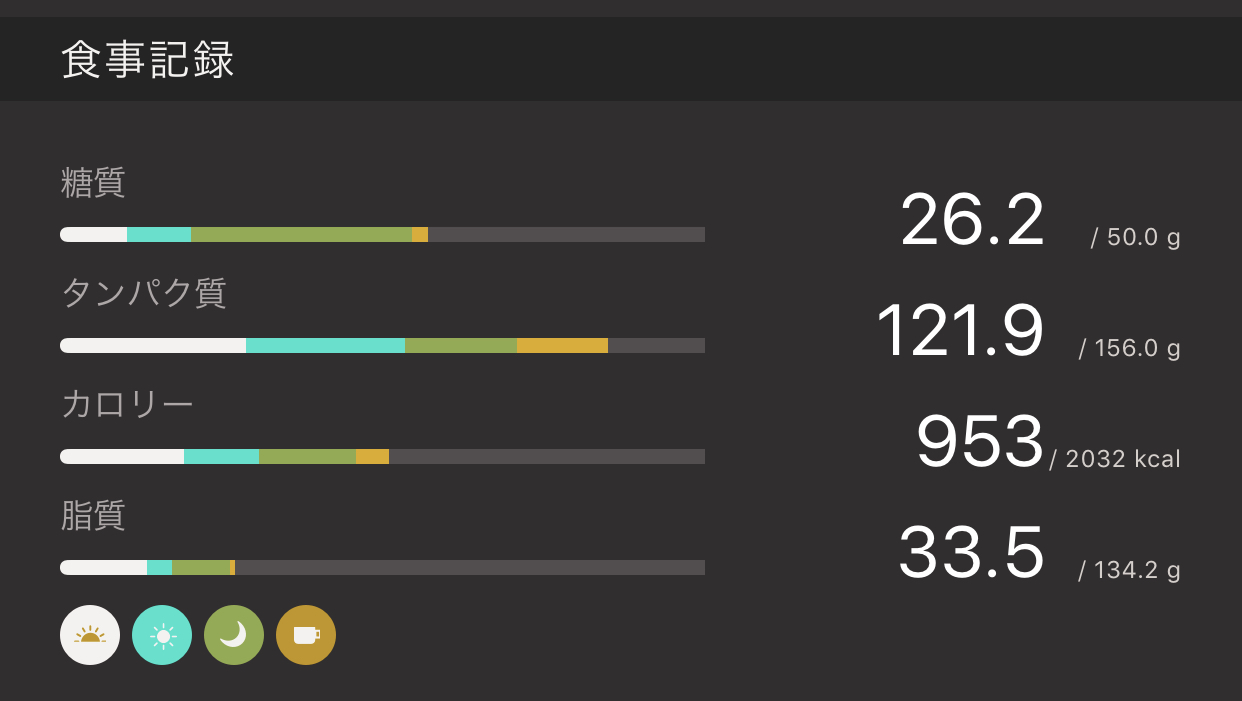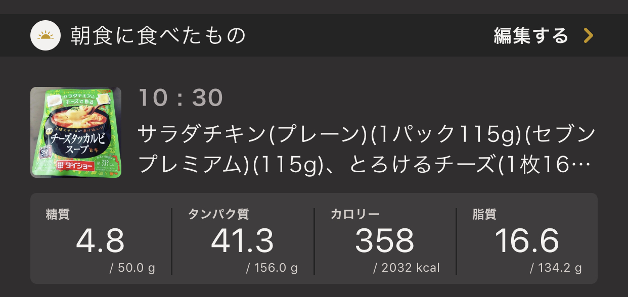 一度で一気にタンパク質を摂るのではなく、分食して、足りない分は間食で補うというのが、ライザップの糖質制限の基本的な考え方です。それと、夕食は少しタンパク質多かったようです。豆腐一丁はやっぱり多いかも(笑)
