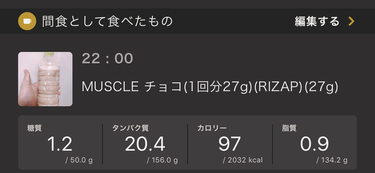 一応ライザップではプロテインも間食として考えます。この日の間食はこれのみです。