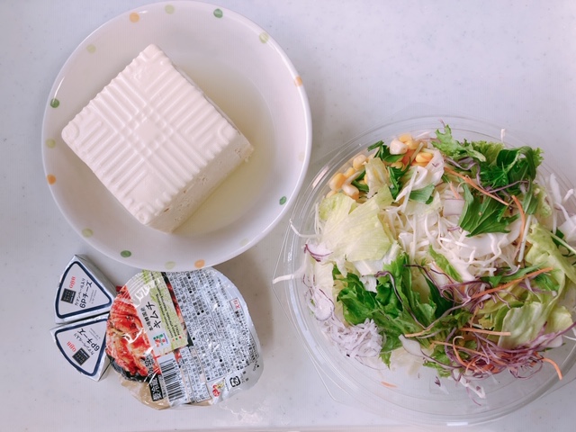 【夕食】豆腐、サラダ、キムチ