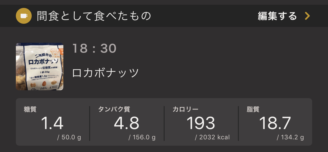 僕が大好きロカボナッツです。ライザップ始めてからナッツ類を食べるようになったのですが、ナッツって美味しいですよね。そして、結構腹持ちいいんです。