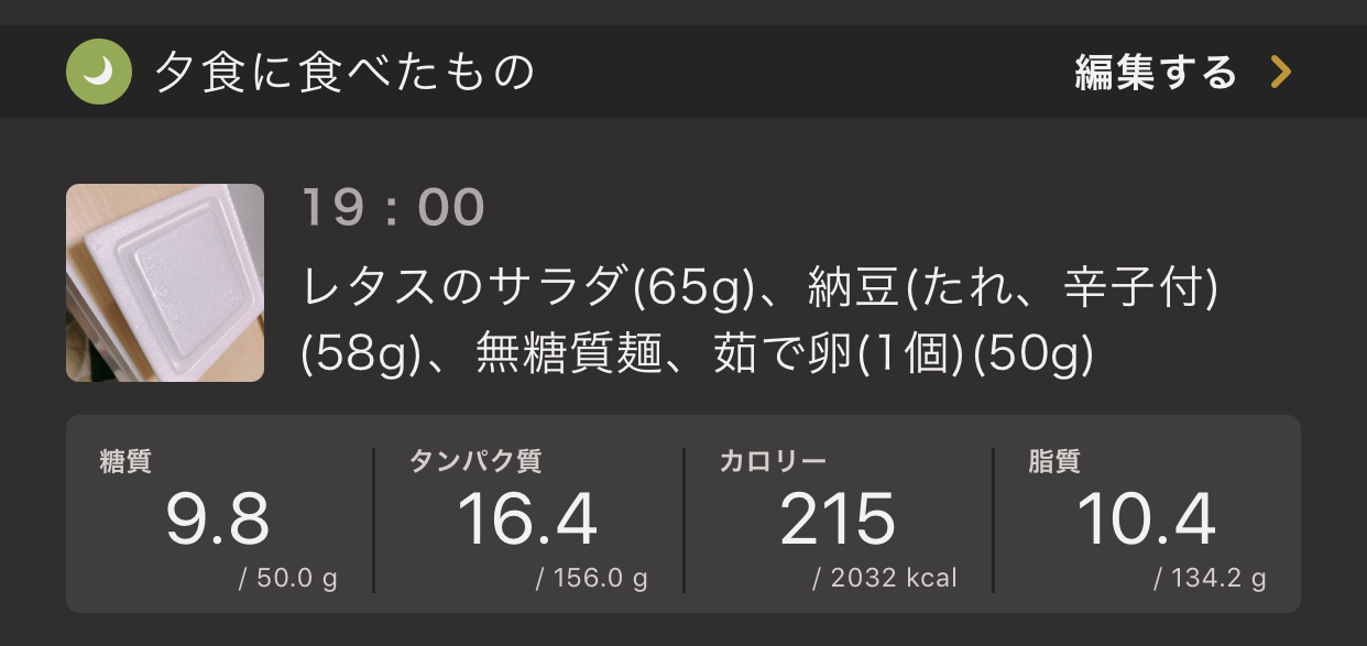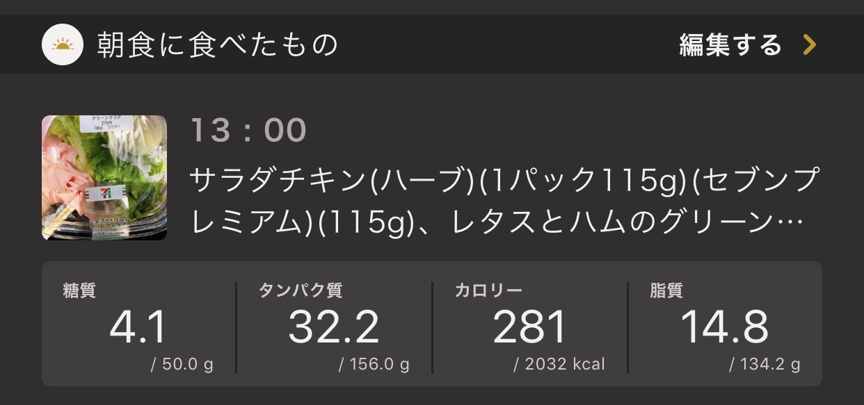 タンパク質もしっかりと摂れています。糖質は4gと少ないです。ということで朝食は問題なさそう。