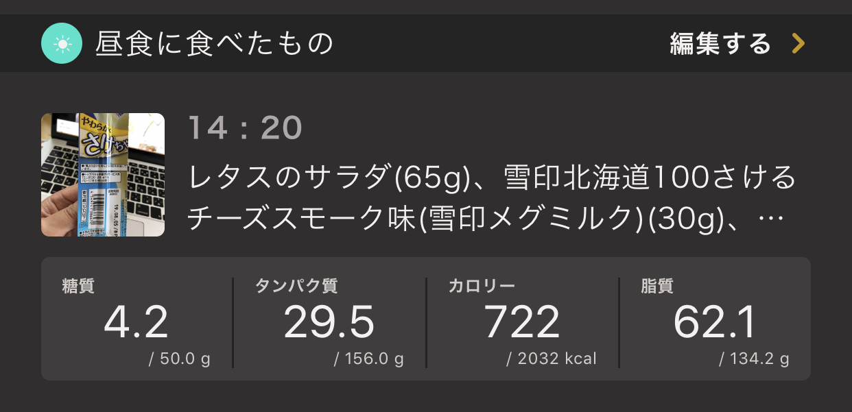 脂身が多いので少しカロリー高めですが、許容範囲内です。タンパク質も30gとちょうどいい感じです。更にさけるチーズも食べてます。