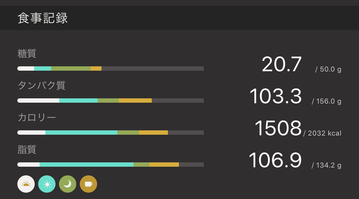 霜降りロース肉を食べたのでカロリーが別の日に比べて少し高めですが、これでもまだ1日のカロリー摂取量の許容範囲です。