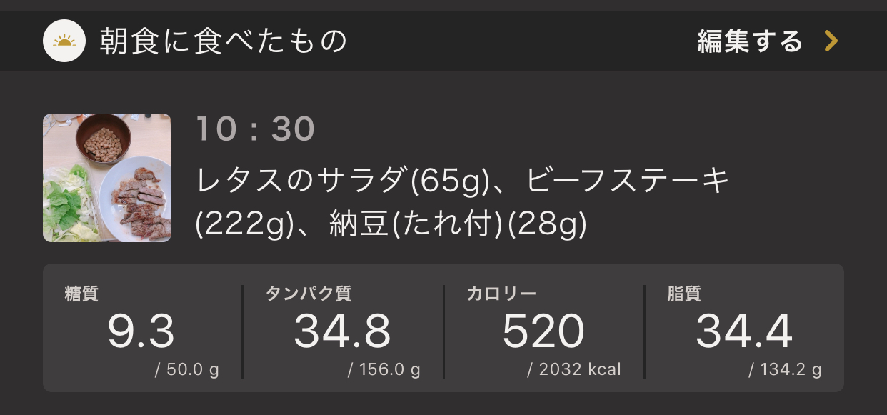 動物性タンパク質、植物性タンパク質両方をしっかりととりました。ステーキは昨日スーパーで2切れ入りを購入していたので、その半分を今朝食べました。