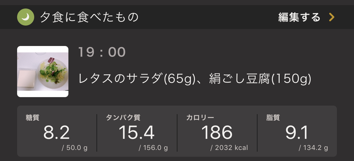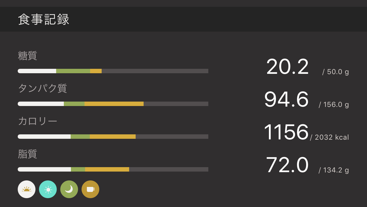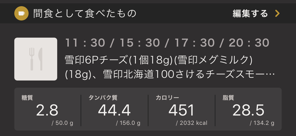 食事に関して特に問題なかったようです。間食も摂れていますし、夜が抑えられたのがかなり良かったです。