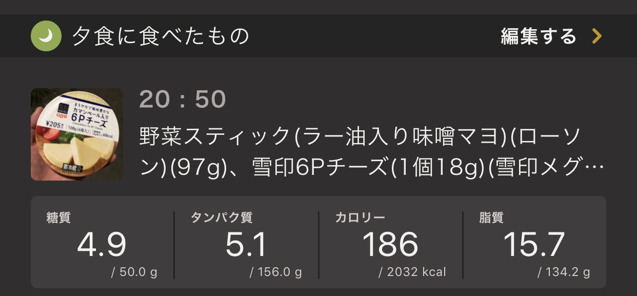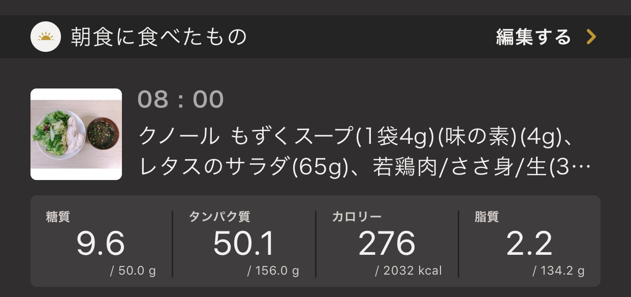 当然ですが、栄養素もかなり少量です。でも不思議とこの日、お腹空いてませんでした。おそらくですが、糖質制限しているので、胃袋も少し小さくなっていると思います。