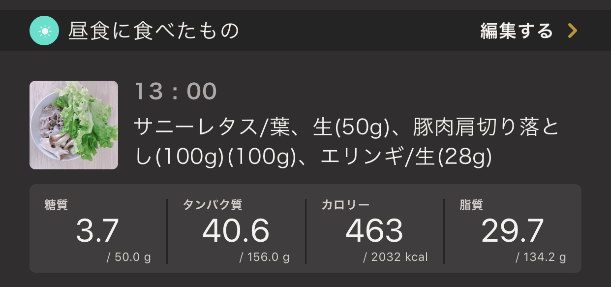 朝食でタンパク質50g、昼食でタンパク質40gと結構なハイペースでタンパク質を摂取しています。