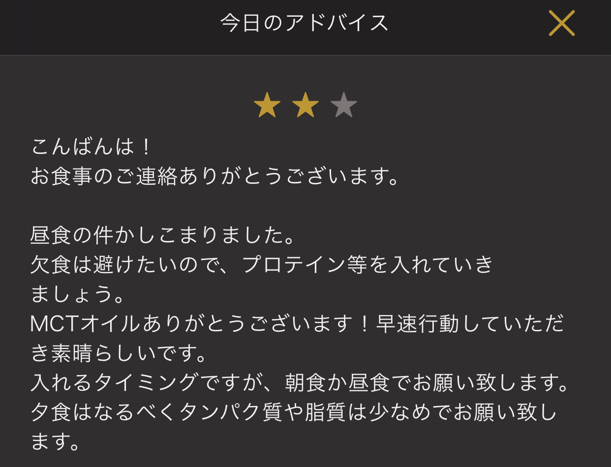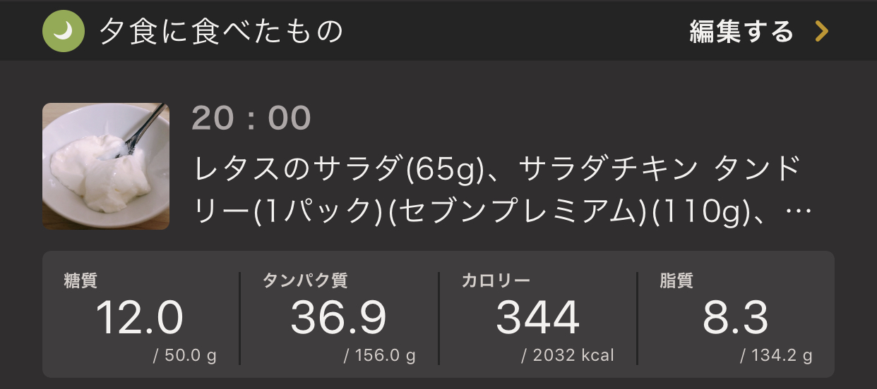 昼食を食べてないのですが、これについては、間食でプロテインで補ってとのことでした。ただ、食べれるならサラダ抜きでもサラダチキンだけでも食べてくださいとのことでした。