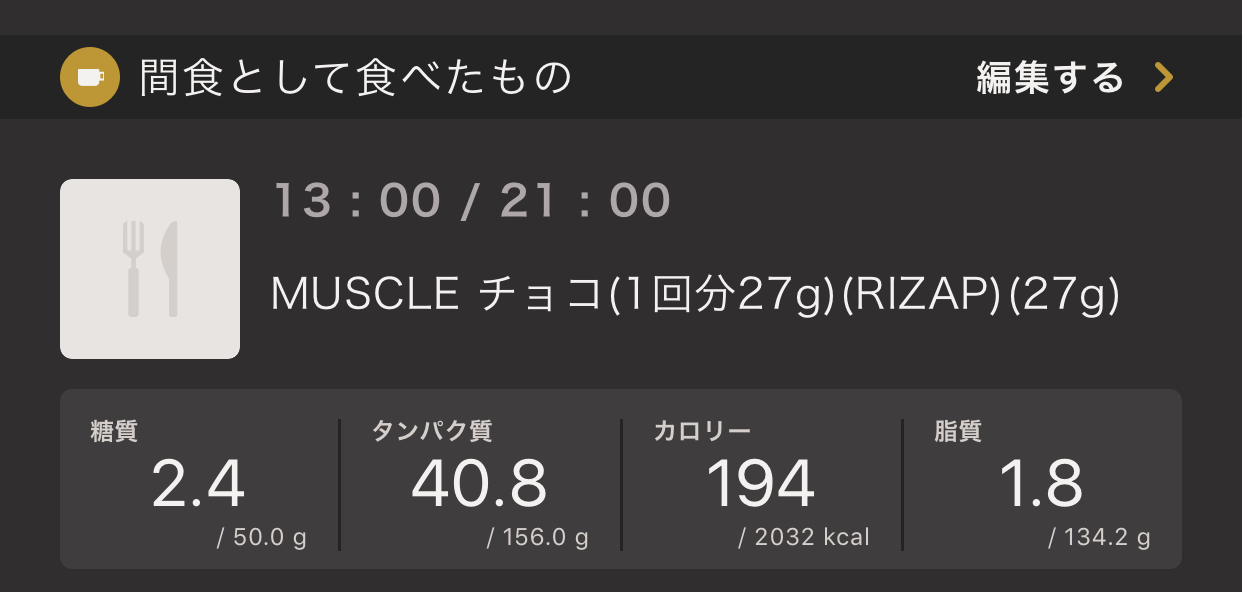 以前、この記事で、欠食の時はプロテインを1杯多く飲んで補ってくださいというアドバイスも有ったので、今回は、間食で、プロテインを2杯飲みました。