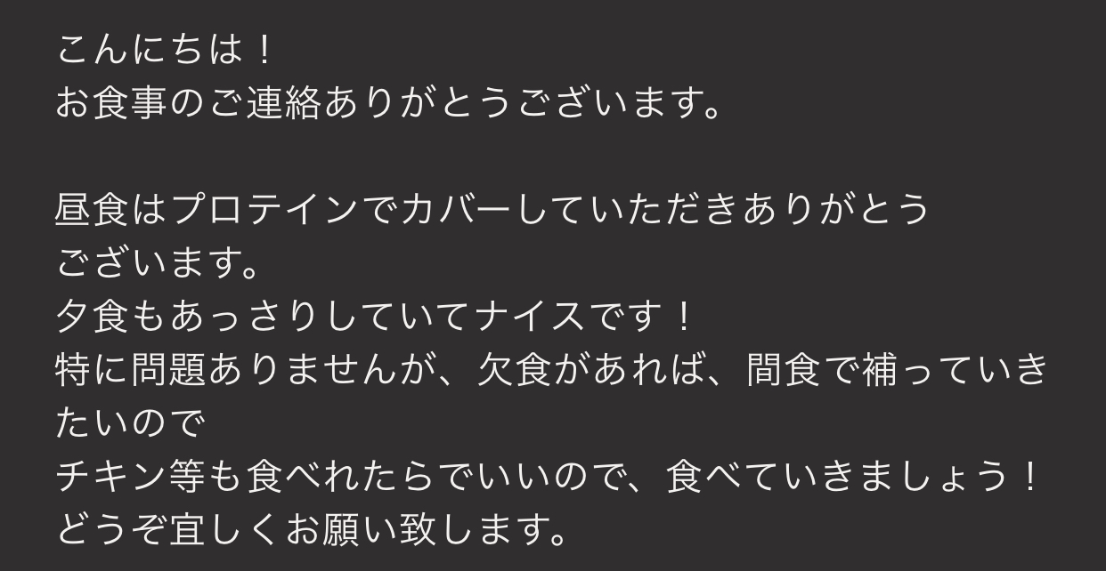 朝食はもう少しタンパク質を増やしても良いとのことでした。確かに24gだったので、30g位有ってよかった。