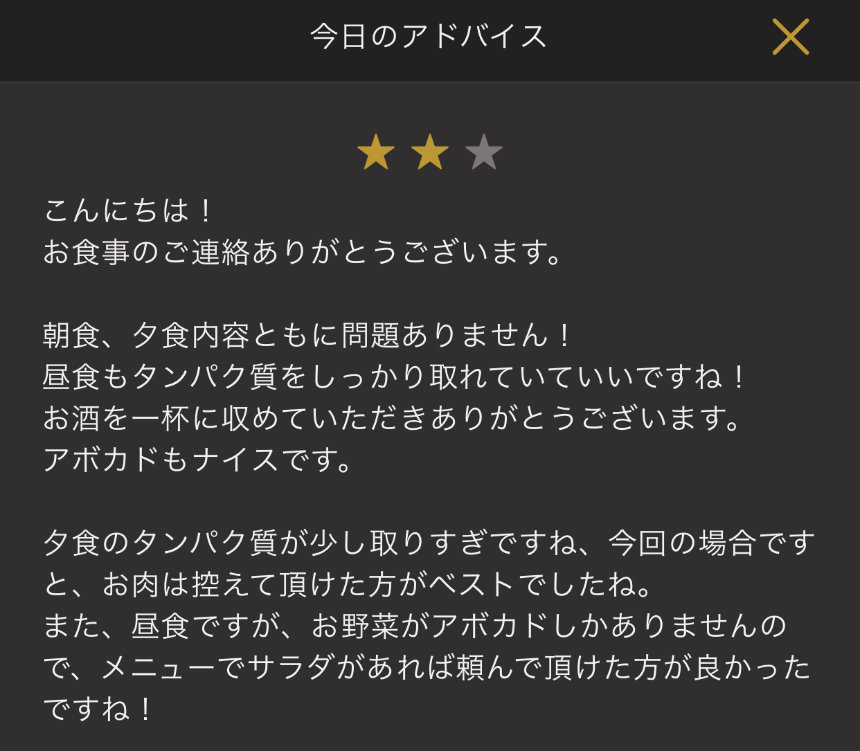 ただ、夕食のタンパク質に関して、やはり突っ込まれました。夜は動物性タンパク質より植物性タンパク質が良いとのことです。
