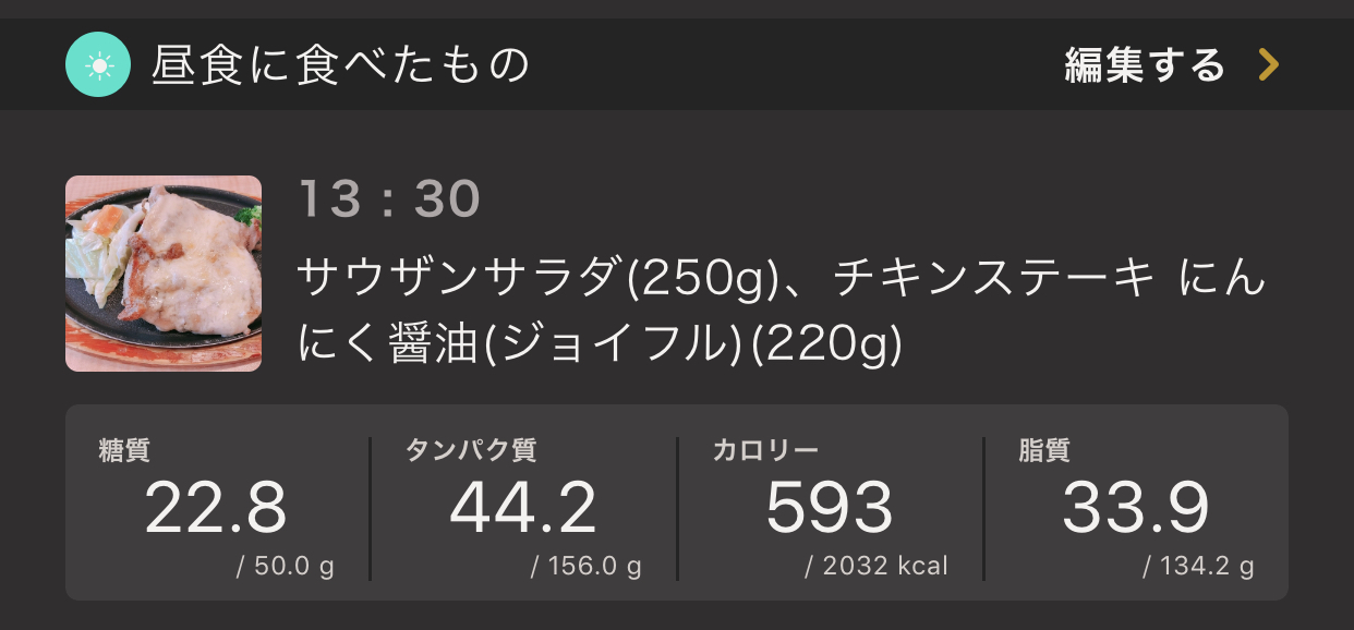 ジョイフルのチキンステーキは結構量が多かったかもしれません。タンパク質が40gオーバーとなってしまいました。さらに糖質が圧倒的に高すぎました。。。