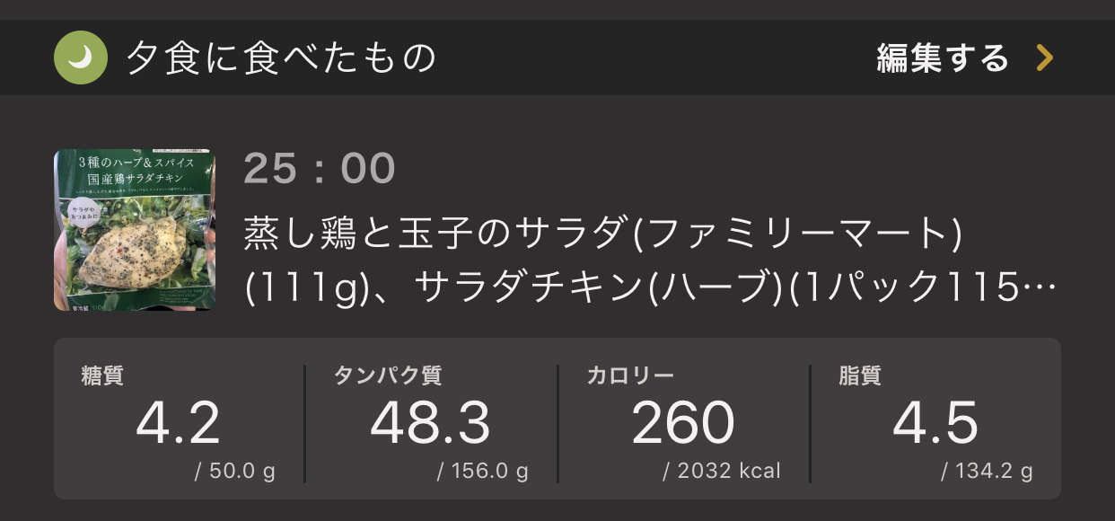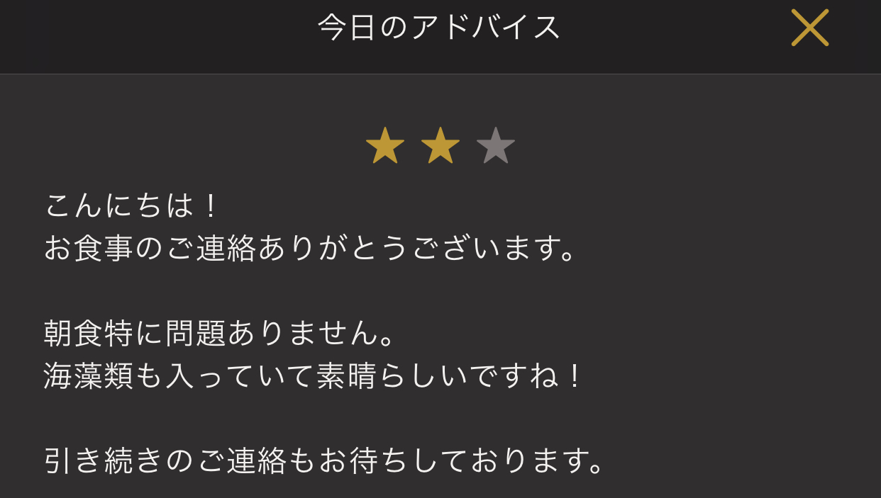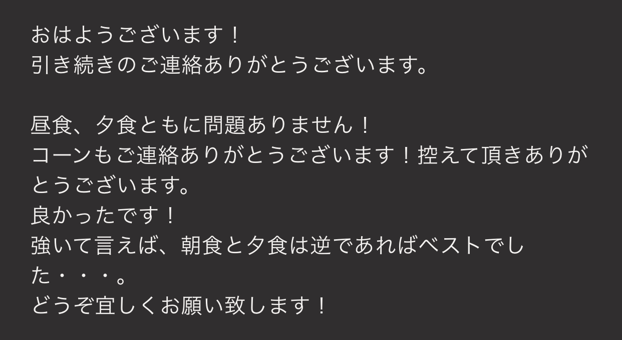 昼食・夕食は特に問題ない感じとのこと。ただ、朝食・夕食が逆だと良かったそうです。確かに夜にしてはタンパク質が多すぎ、朝はタンパク質が少なかったので、逆ですね。。。