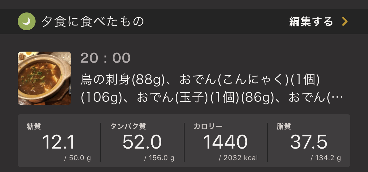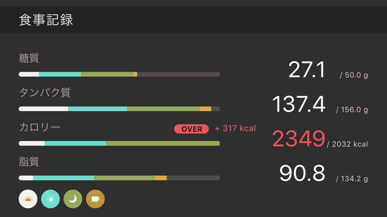 カロリーの部分だけですが、久々に、1日の制限をオーバーしてしまいました。オーバーしたのはライザップ1日目以来です。